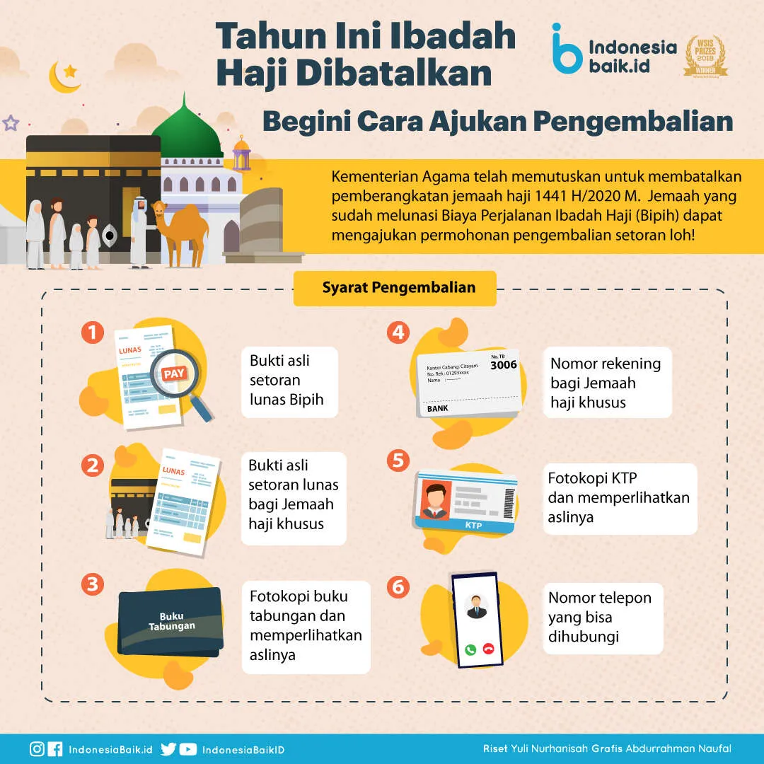 Indonesiabaik.id - Kementerian Agama telah memutuskan untuk membatalkan pemberangkatan jemaah haji 1441 H/2020 M. Bersamaan dengan itu, jemaah yang sudah melunasi Biaya Perjalanan Ibadah Haji (Bipih) dapat mengajukan permohonan pengembalian setoran (refund) pelunasan.