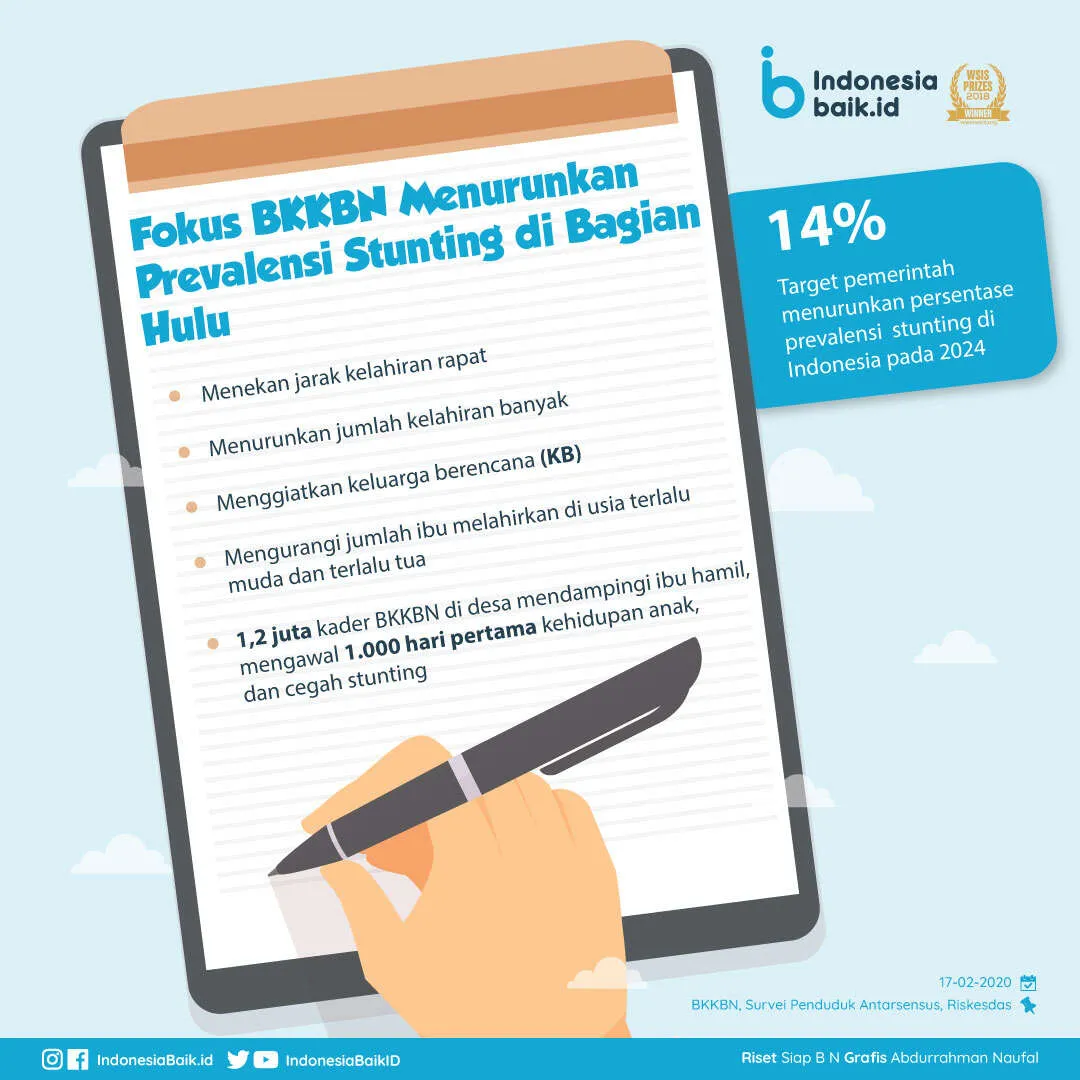 Wakil Presiden Ma'ruf Amin mengingatkan Badan Kependudukan dan Keluarga Berencana Nasional (BKKBN) ikut berkontribusi dalam menurunkan angka prevelensi stunting (anak kerdil) di Indonesia. Menurut Ma'ruf, peran BKKBN diperlukan untuk menyukseskan program pemerintah menurunkan angka stunting hingga 14 persen.
