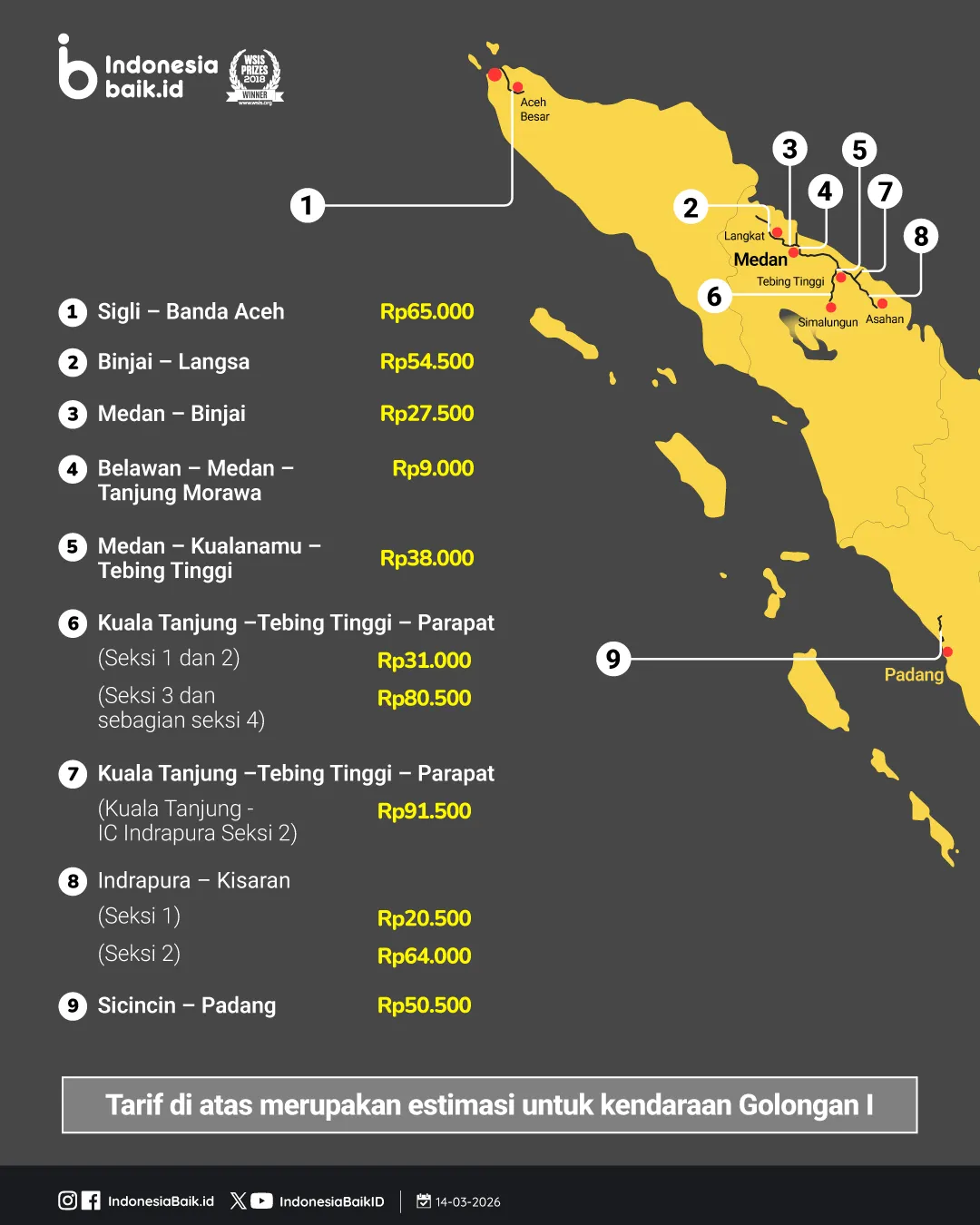 Beberapa di antaranya seperti ruas Sigli–Banda Aceh sekitar Rp65.000, Medan–Binjai sekitar Rp27.500, hingga Pekanbaru–Dumai yang mencapai sekitar Rp171.500.