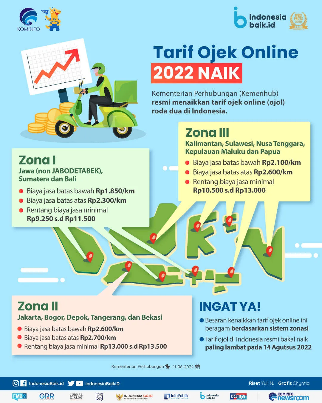 Indonesiabaik.id - Kementerian Perhubungan (Kemenhub) resmi menaikkan tarif ojek online (ojol) roda dua di Indonesia. Adapun besaran kenaikkan tarif ojek online ini beragam berdasarkan sistem zonasi.