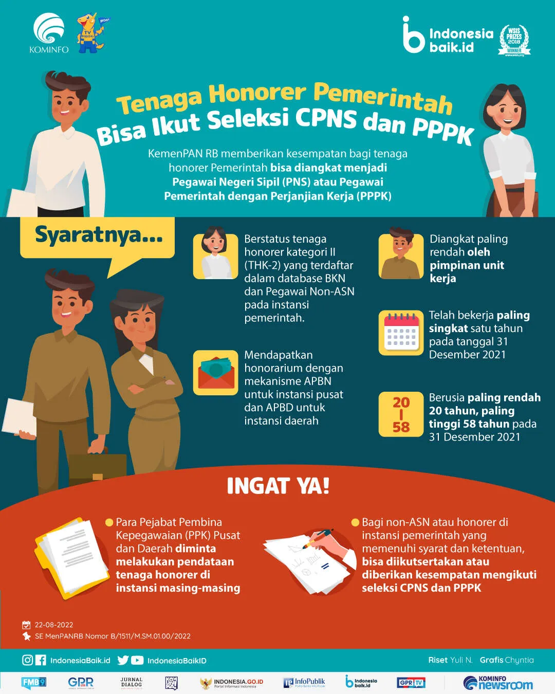 Selanjutnya, bagi non-ASN atau honorer di instansi pemerintah yang memenuhi syarat dan ketentuan, bisa diikutsertakan atau diberikan kesempatan mengikuti seleksi CPNS dan PPPK. Adapun syarat dan ketentuan tenaga honorer yang bisa mengikuti seleksi CPNS dan PPPK, antara lain: