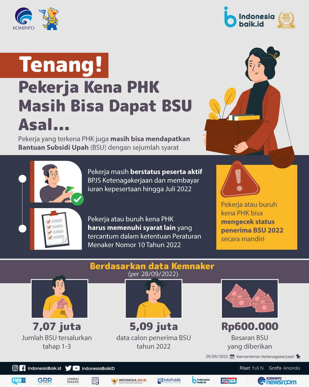 Dikutip dari akun Instagram resmi @kemnaker, pekerja atau buruh yang terkena PHK masih bisa menerima BSU senilai Rp600.000. Meski terkena PHK, bagi pekerja yang masih berstatus peserta aktif BPJS Ketenagakerjaan dan membayar iuran kepesertaan hingga Juli 2022, masih berpotensi menerima BSU.