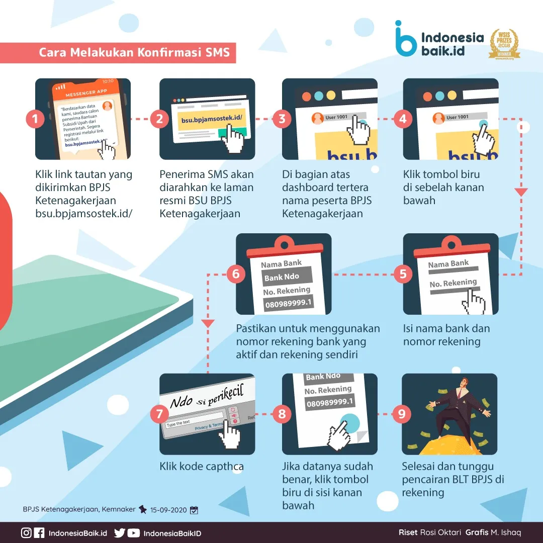 Bagi pekerja yang menerima notifikasi SMS seperti teks di atas, harus segera melakukan konfirmasi regstrasi nomor rekening untuk pencairan BLT bantuan BPJS. Berikut cara melakukan konfirmasi SMS notifikasi bagi pekerja penerima subsidi gaji BPJS Ketenagakerjaan: