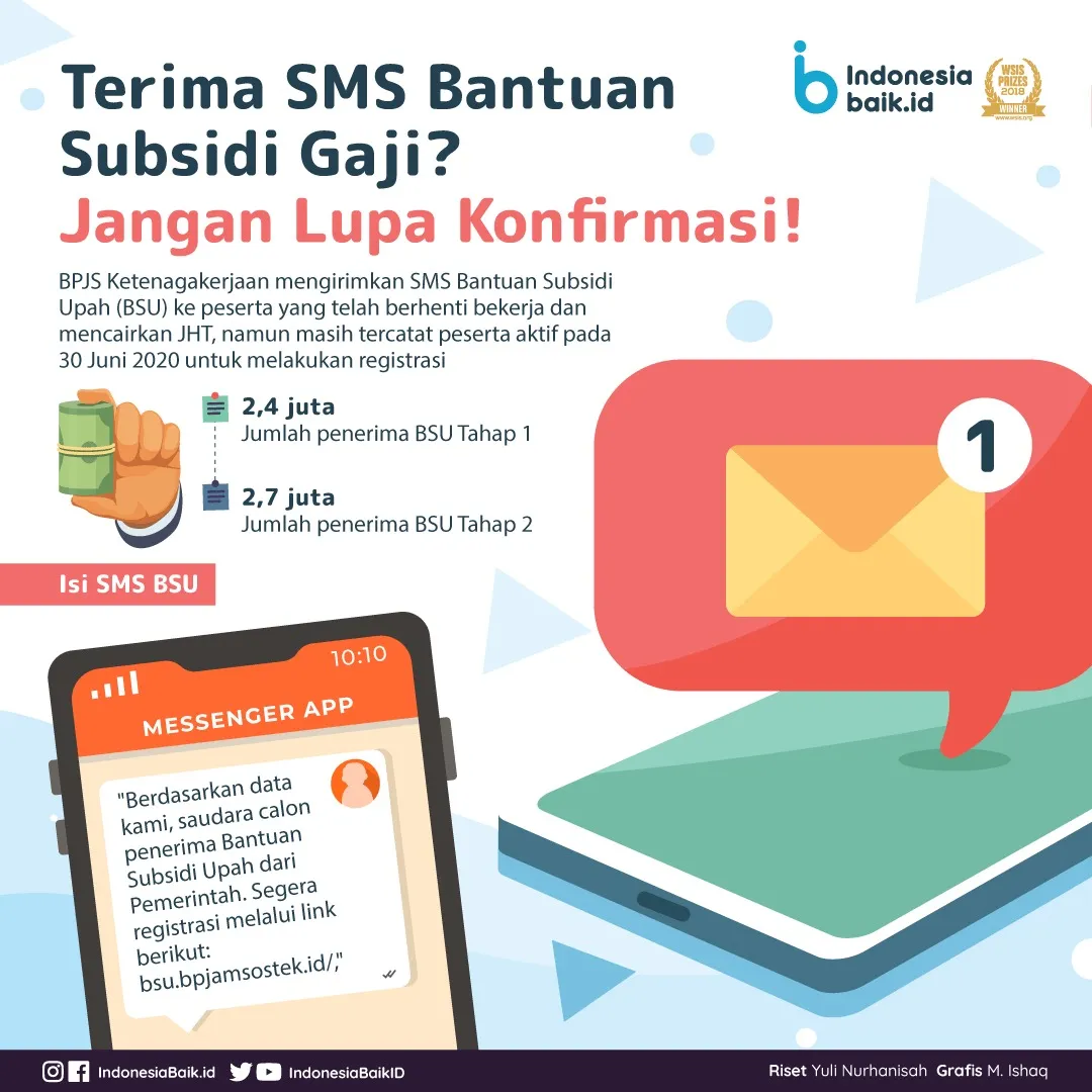 Indonesiabaik.id - BPJS Ketenagakerjaan atau BP Jamsostek mengirimkan SMS blasting Bantuan Subsidi Upah (BSU) atau subsidi gaji Rp 600.000 ke sejumlah pekerja calon penerima subsidi gaji karyawan. Melalui Instagram, BP Jamsostek memberitahukan isi SMS itu berupa tautan (link) aktif untuk melakukan registrasi.