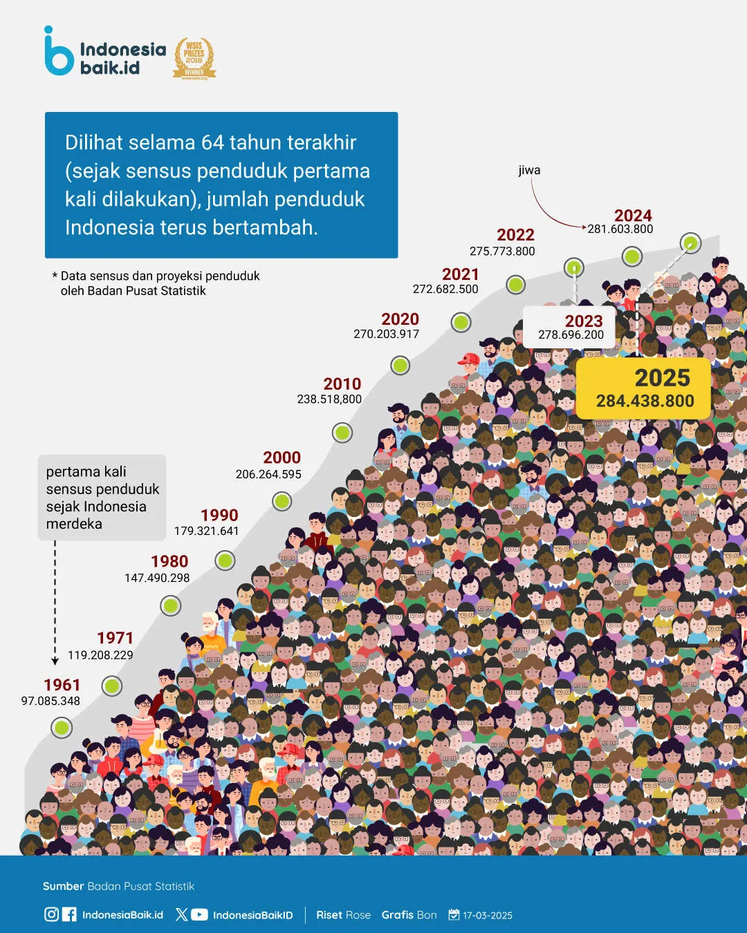 Begitupun jika ditarik ke belakang sejak sensus penduduk pertama kali diselenggarakan sejak Indonesia merdeka yakni pada 1961. Jumlah penduduk Indonesia saat itu terdata sebanyak 97 juta jiwa. Lalu 64 tahun setelahnya, jumlah pendudukny terus bertambah seiringnya waktu hingga mencapai persentase kenaikan sebesar 192,9% atau hampir 200% pada 2025