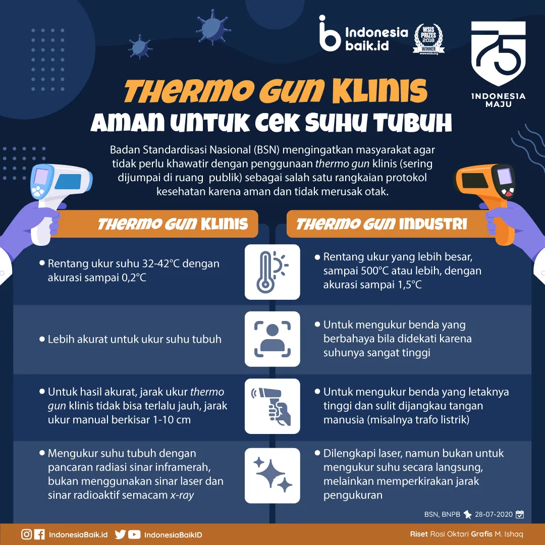 BSN mengingatkan agar masyarakat masyarakat tidak perlu khawatir dengan pengukuran suhu tubuh menggunakan thermogun sebagai salah satu rangkaian protokol kesehatan. Dan menganjurkan untuk menggunakan thermogun jenis klinik untuk mendapatkan hasil pengukuran yang lebih baik daripada thermogun industri.
