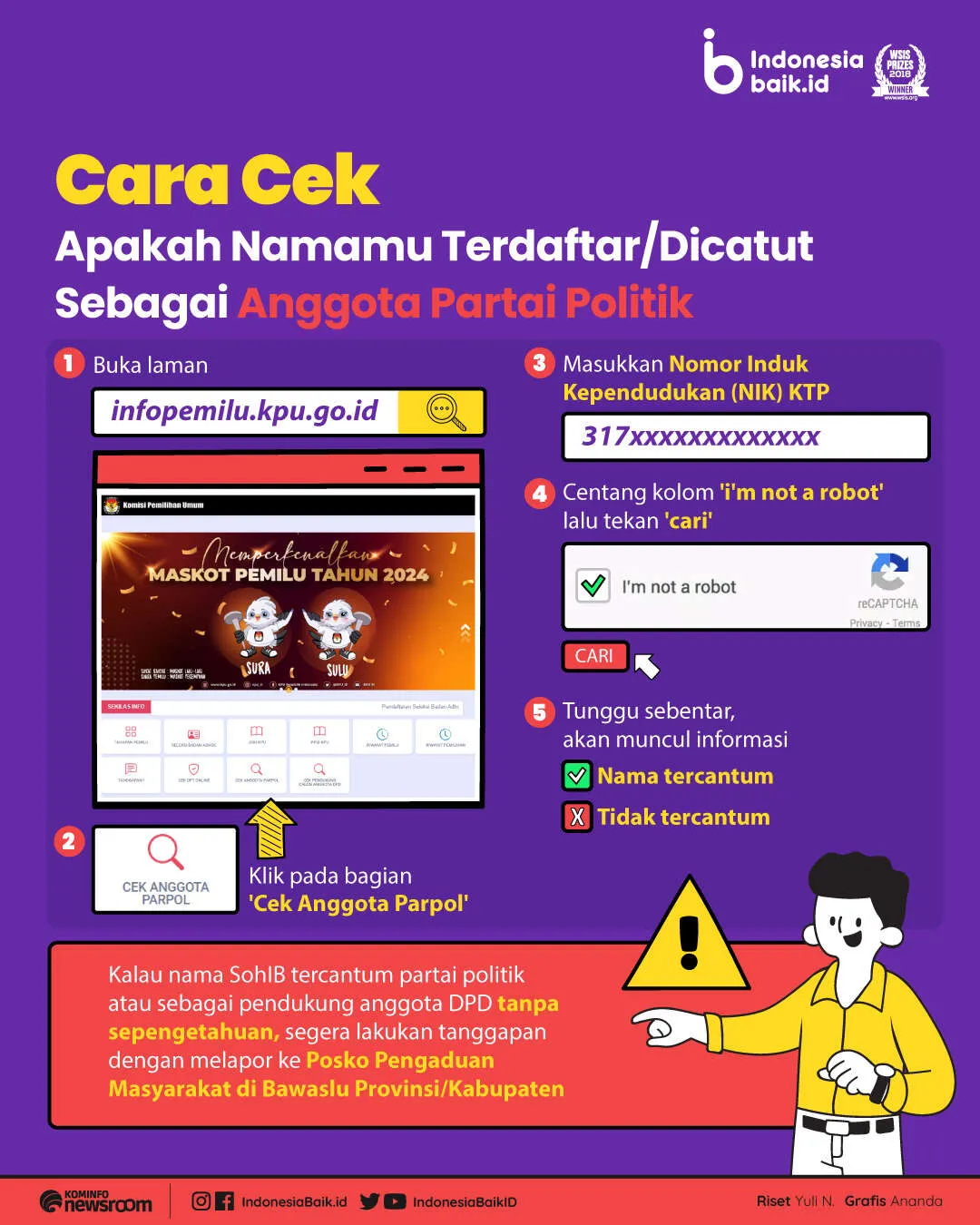 Melalui portal yang disediakan KPU, masyarakat bisa mengecek apakah namanya dicatut atau tidak oleh parpol tertentu dengan digunakan secara tidak bertanggung jawab untuk daftar Pemilu. Cara cek ini cukup mudah, hanya dengan memasukkan nomor identitas di kolom yang sudah disediakan.