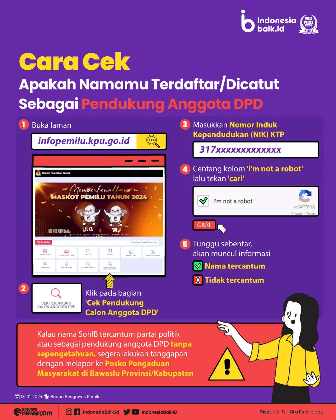 Indonesiabaik.id - Komisi Pemilihan Umum (KPU) bersama Badan Pengawas Pemilu menyediakan fitur khusus bagi masyarakat untuk mengecek apakah terdaftar sebagai anggota partai politik, pendukung anggota DPD atau tidak pada pemilu 2024.