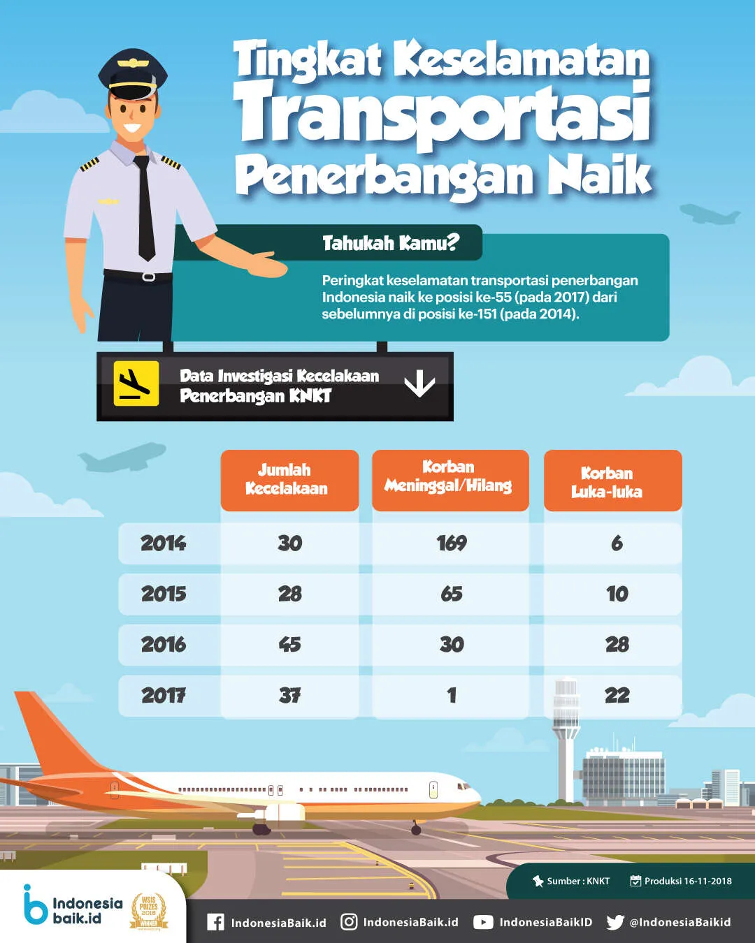 Indonesiabaik.id - Tahukah kamu? Ternyata, keselamatan transportasi penerbangan di Indonesia setiap tahunnya mengalami peningkatan sebelum terjadinya insiden tragis Lion Air JT-610 di perairan Karawang pada 29 Oktober 2018. Peringkat keselamatan transportasi penerbangan di Indonesia melesat ke posisi 55 pada akhir 2017 setelah sebelumnya berada pada posisi 141 pada 2014.