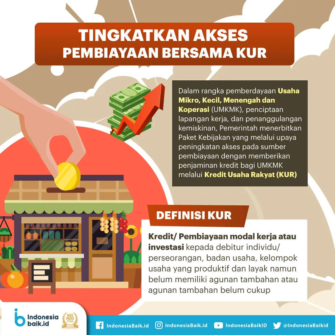 Upaya peningkatan akses pada sumber pembiayaan antara lain dilakukan dengan memberikan penjaminan kredit bagi UMKMK melalui Kredit Usaha Rakyat (KUR). Kredit Usaha Rakyat (KUR) adalah kredit/pembiayaan modal kerja dan/atau investasi kepada debitur individu/perseorangan, badan usaha dan/atau kelompok usaha yang produktif dan layak namun belum memiliki agunan tambahan atau agunan tambahan belum cukup.