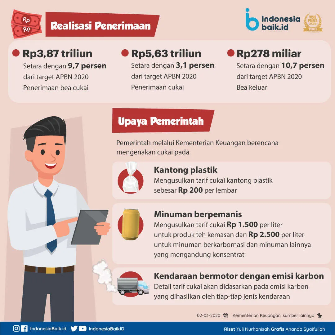 Pemerintah berencana mengenakan cukai pada kantong plastik, minuman berpemanis, hingga kendaraan bermotor dengan emisi karbon. Dari tambahan objek cukai tersebut, pemerintah berharap dapat mengerek penerimaan negara hingga Rp 23,55 triliun.