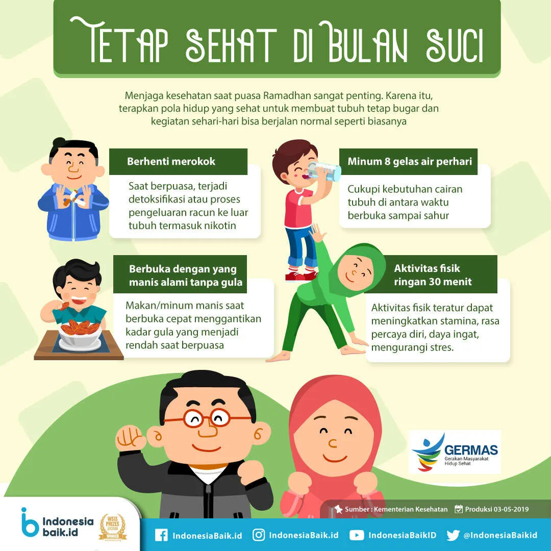 Indonesiabaik.id - Menjaga kesehatan saat puasa Ramadhan sangat penting. Karena itu, terapkan pola hidup yang sehat untuk membuat tubuh tetap bugar dan kegiatan sehari-hari bisa berjalan normal seperti biasanya.