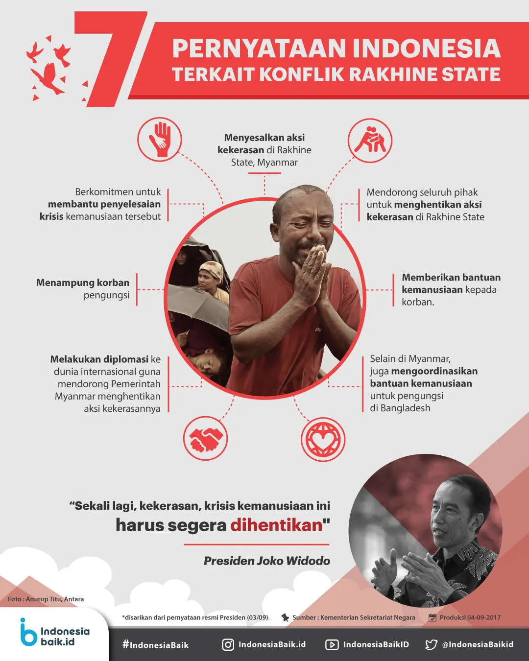 Presiden Joko Widodo menyampaikan pernyataan resmi terkait aksi kekerasan dan krisis kemanusiaan di Rakhine State, Myanmar. Pernyataan resmi tersebut dirangkum menjadi tujuh poin penting.