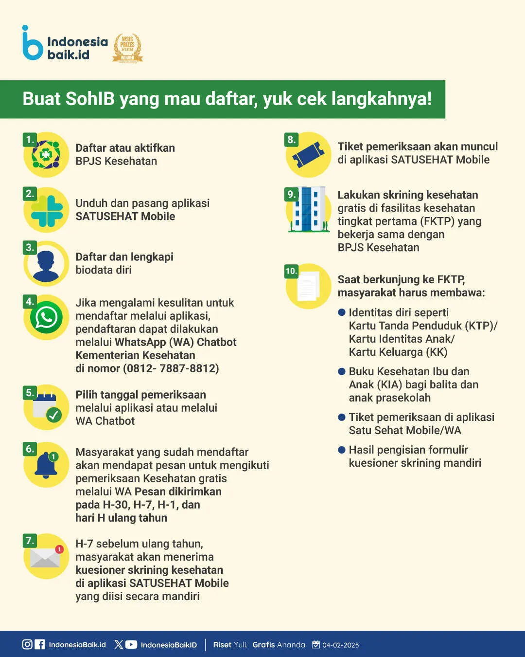 Langkah-Langkah Skrining Kesehatan Gratis1. Daftar atau aktifkan BPJS Kesehatan 2. Unduh dan pasang aplikasi Satu Sehat Mobile 3. Daftar dan lengkapi biodata diri 4. Jika mengalami kesulitan untuk mendaftar melalui aplikasi,