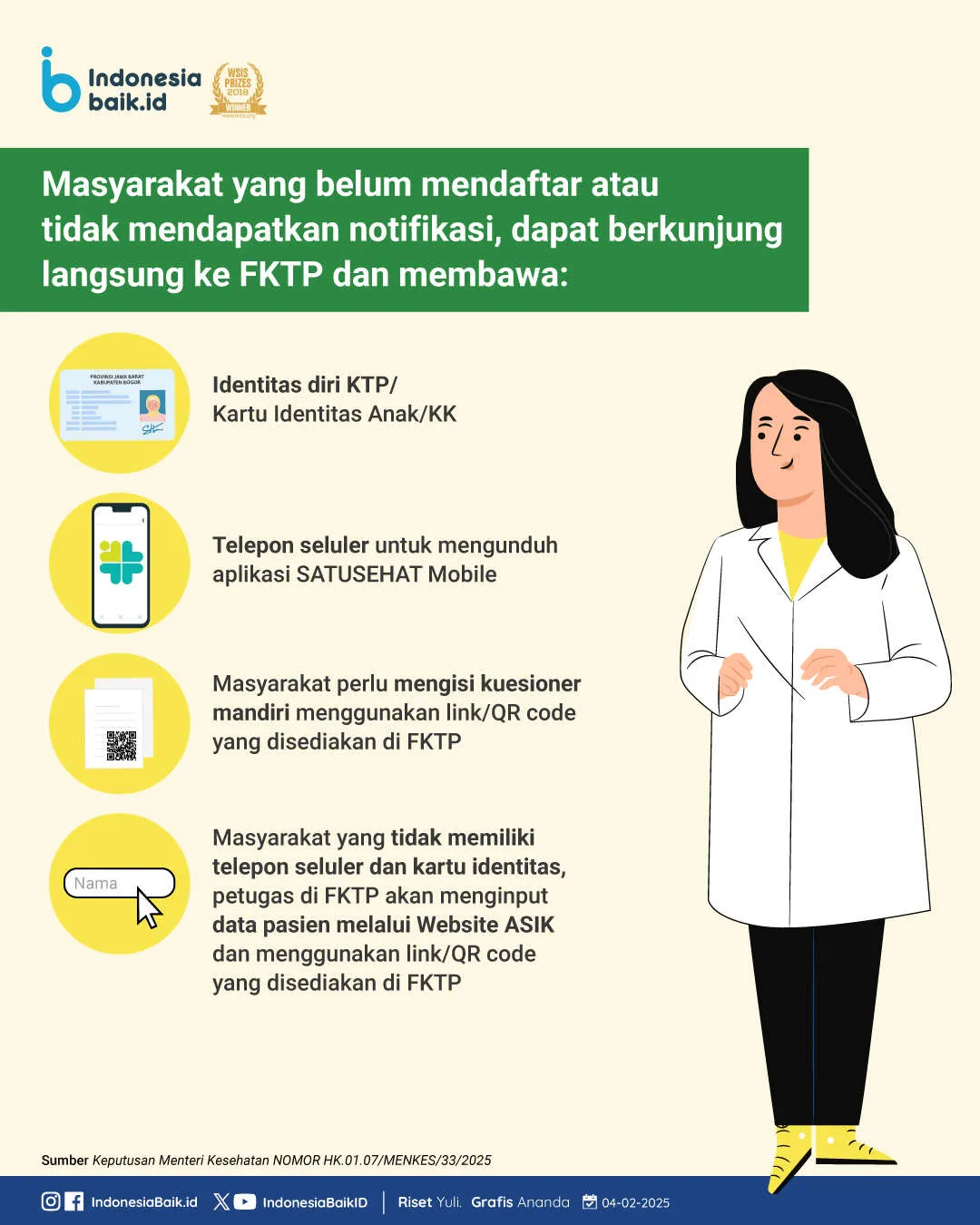 - Dokumen yang Dibawa: Saat melakukan skrining, masyarakat perlu membawa KTP, Kartu Keluarga (KK), atau Kartu Identitas Anak (KIA). Untuk balita dan anak prasekolah, bawa juga Buku Kesehatan Ibu dan Anak.