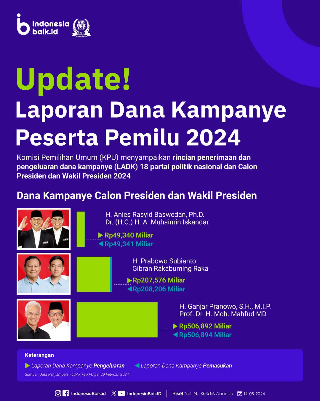 indonesiabaik.id - Komisi Pemilihan Umum (KPU) menyampaikan rincian penerimaan dan pengeluaran dana kampanye (LADK) 18 partai politik nasional dan Calon Presiden dan Wakil Presiden 2024.