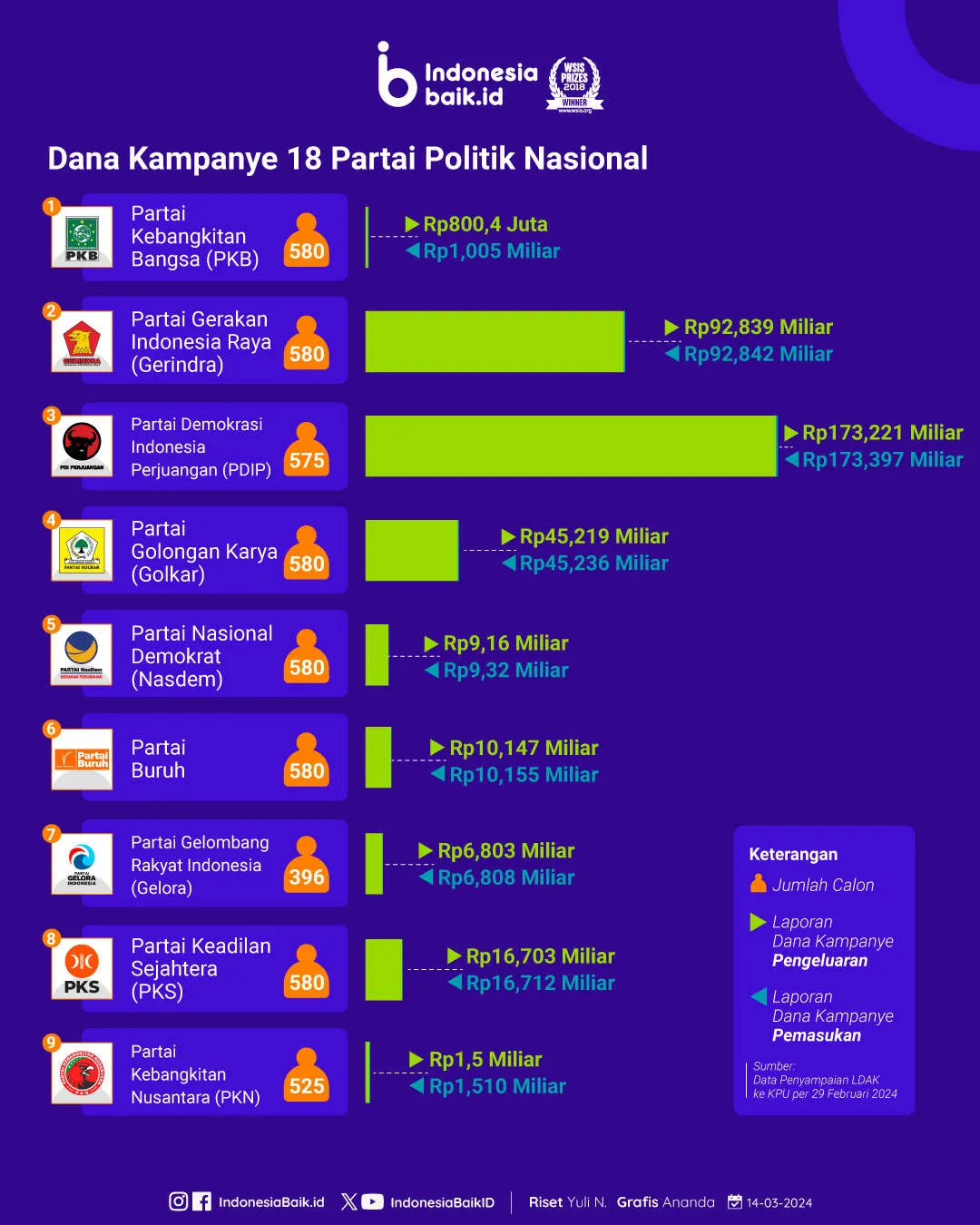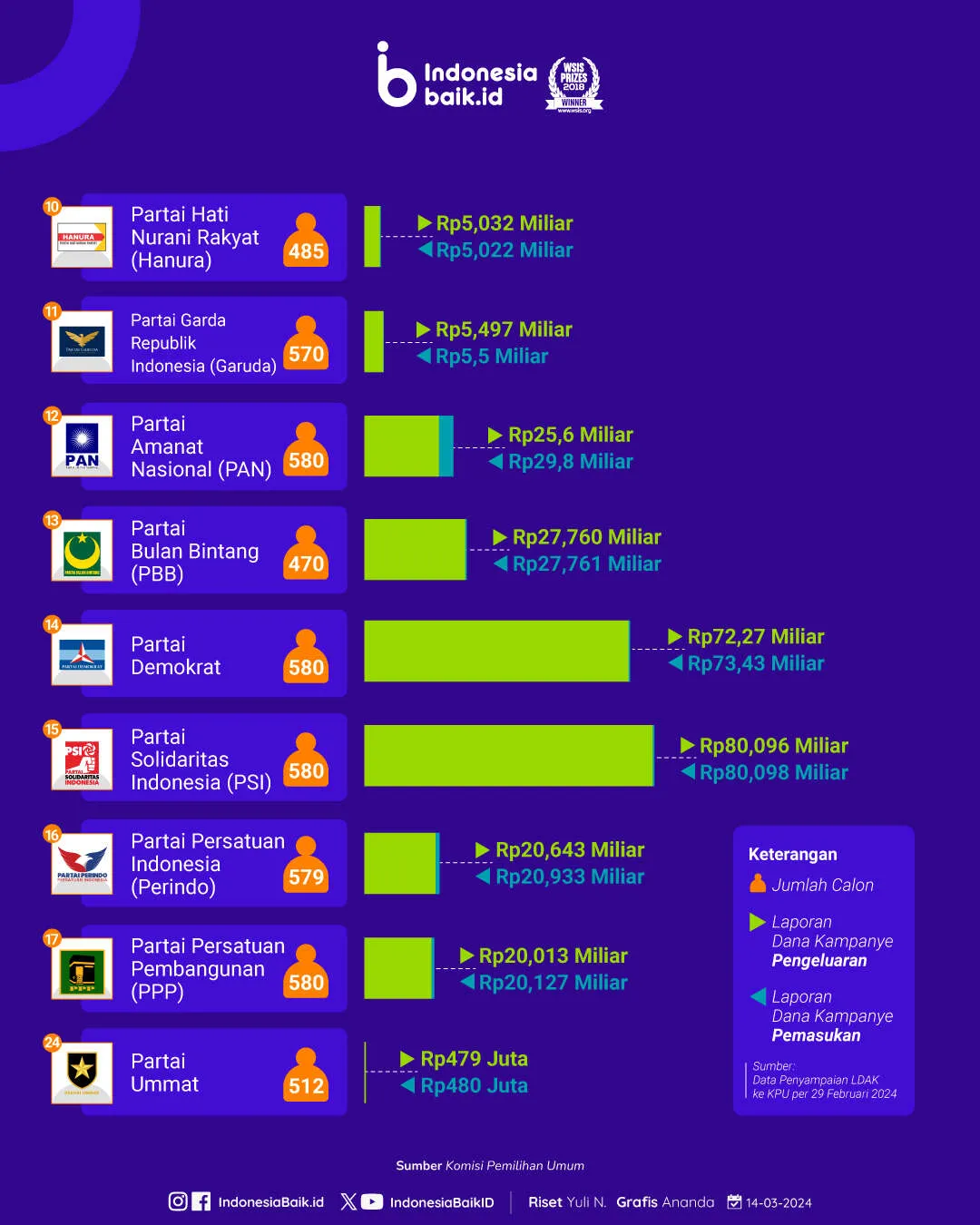 Sementara di posisi terbawah, ada Partai Ummat dengan pengeluaran dana kampanye Rp479,7 juta. Berikut daftar lengkapnya: