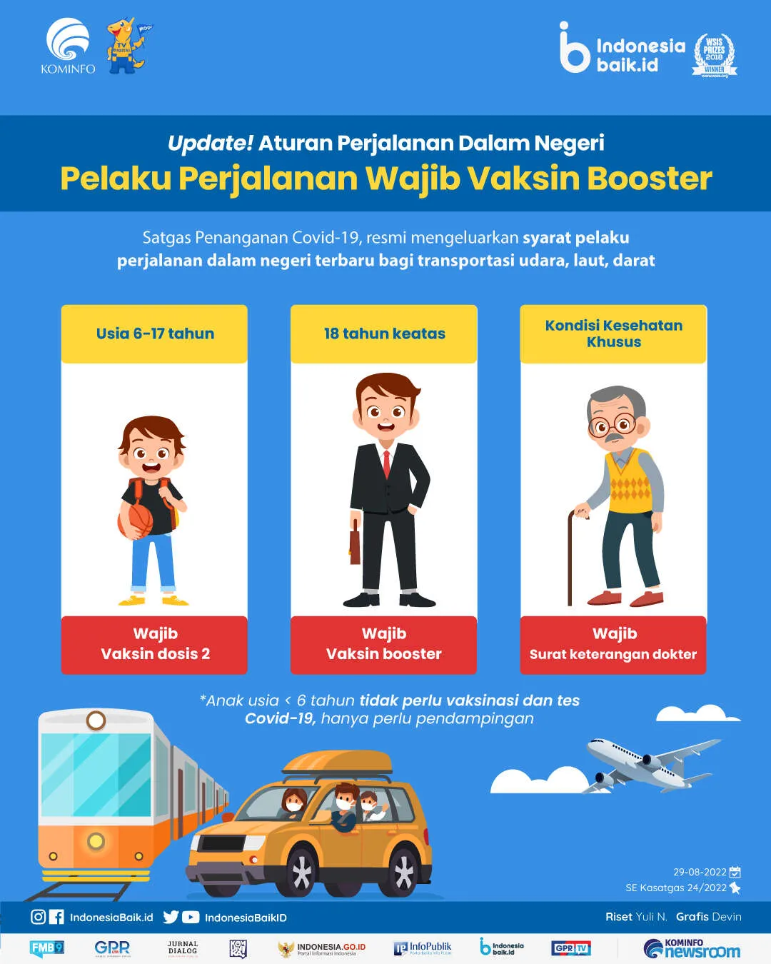 - Untuk PPDN yang berusia di bawah 6 tahun dikecualikan terhadap syarat vaksinasi, akan tetapi wajib melakukan perjalanan dengan pendamping yang telah memenuhi ketentuan vaksinasi Covid-19.