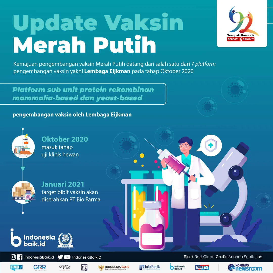 Vaksin Merah Putih yang dikembangkan dengan platform sub unit protein rekombinan mamalia based dan yeast based capai kemajuan. Kemungkinan yang paling cepat dari progress vaksin merah putih yang tengah dikembangkan adalah dari Lembaga Eijkman. Hal itu disampaikan Menteri Riset dan Teknologi/Kepala Badan Riset dan Inovasi Nasional (Menristek/Kepala BRIN) Bambang PS Brodjonegoro dalam dialog “Update KPCPEN: Prinsip Keamanan Vaksin COVID-19” di Gedung Graha BNPB, Selasa, (27/10).