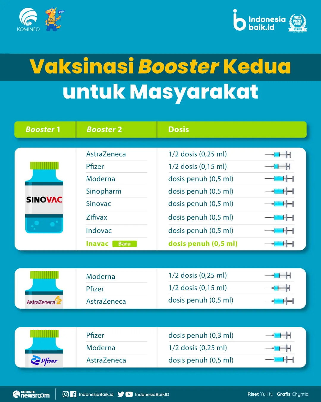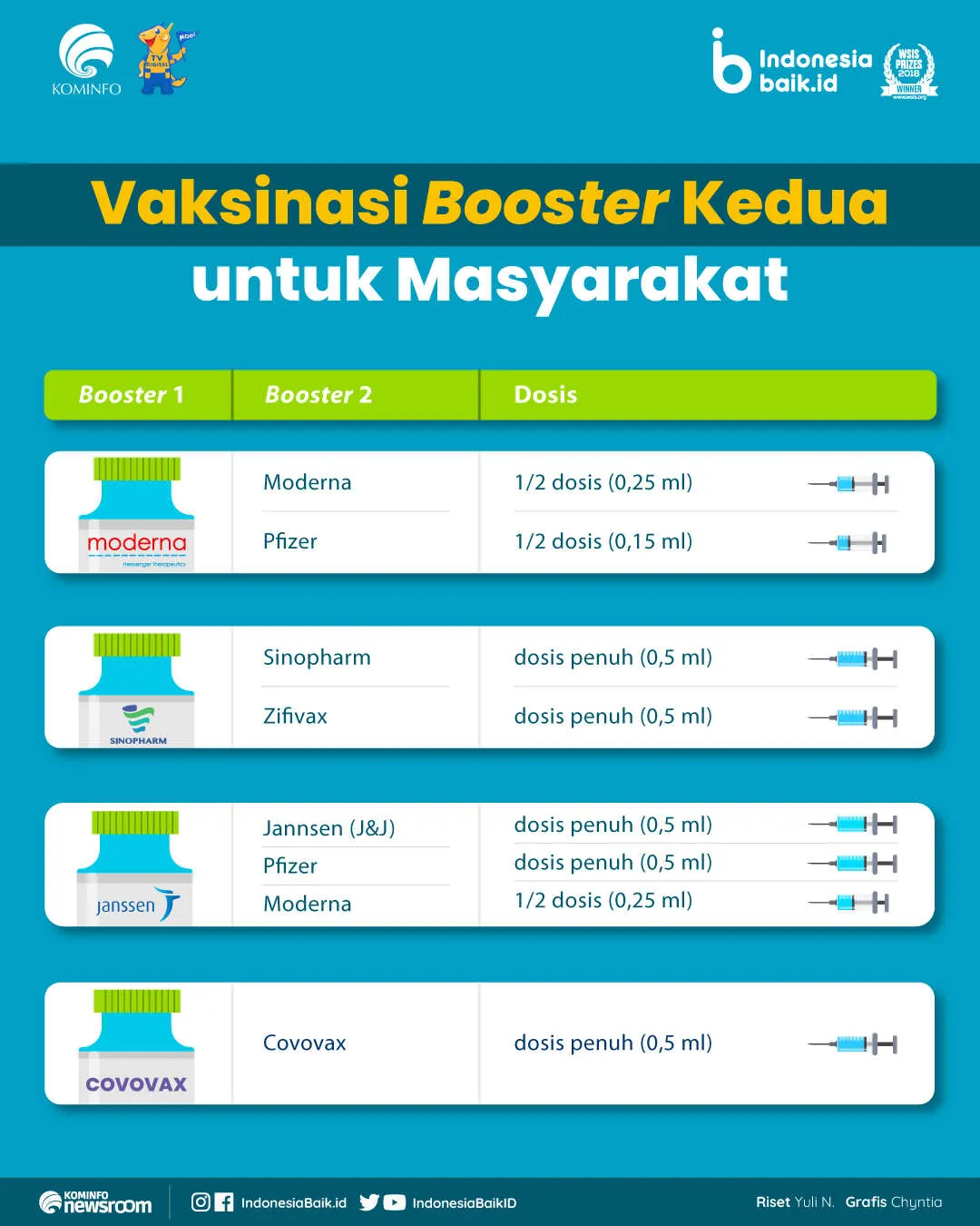 Selain itu, pemberian vaksinasi booster kedua dilakukan lokasi vaksin booster terdekat serta merupakan fasilitas pelayanan kesehatan dan/atau di pos pelayanan vaksinasi Covid-19 serta jenis vaksin yang digunakan dalam booster kedua adalah vaksin covid-19 yang telah mendapatkan persetujuan penggunaan daam kondisi darurat atau Emergency Use Authorization (EUA) dari Badan Pengawas Obat dan Makanan (BPOM).