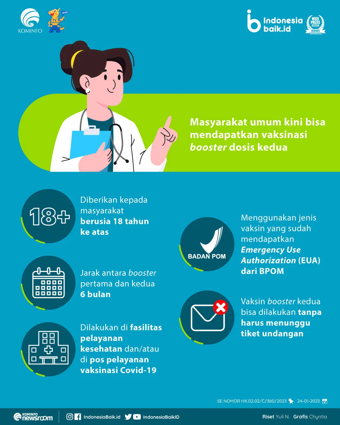 Indonesiabaik.id - Vaksinasi Covid-19 dosis booster kedua sudah mulai dapat diberikan kepada semua masyarakat umum usia 18 tahun ke atas mulai 24 Januari 2023. Peraturan vaksinasi tertuang dalam Surat Edaran Nomor HK.02.02/C/380/2023 Tentang Covid-19 Dosis Booster kedua bagi masyarakat umum.