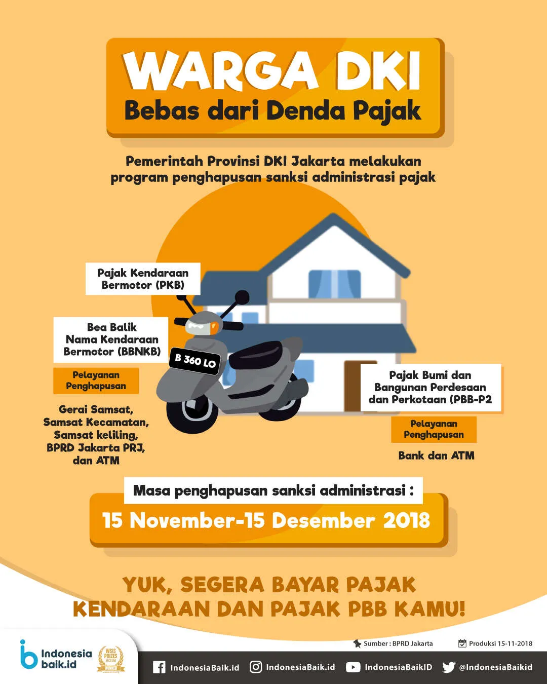**Indonesiabaik.id - ** Pemerintah Provinsi DKI Jakarta memberlakukan penghapusan sanksi administrasi Pajak Kendaraan Bermotor (PKB), Bea Balik Nama Kendaraan Bermotor (BBNKB), dan Pajak Bumi dan Bangunan Perdesaan dan Perkotaan (PBB-P2).