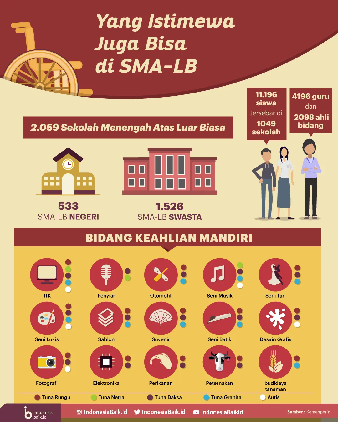 Pada tahun yang sama terdapat 4.196 guru yang mengajar di SMALB dan 2.098 untuk bidang keahlian mandiri. Dengan pendidikan vokasi, diharapkan mereka yang memiliki kebutuhan khusus bisa memiliki keahlian mandiri.