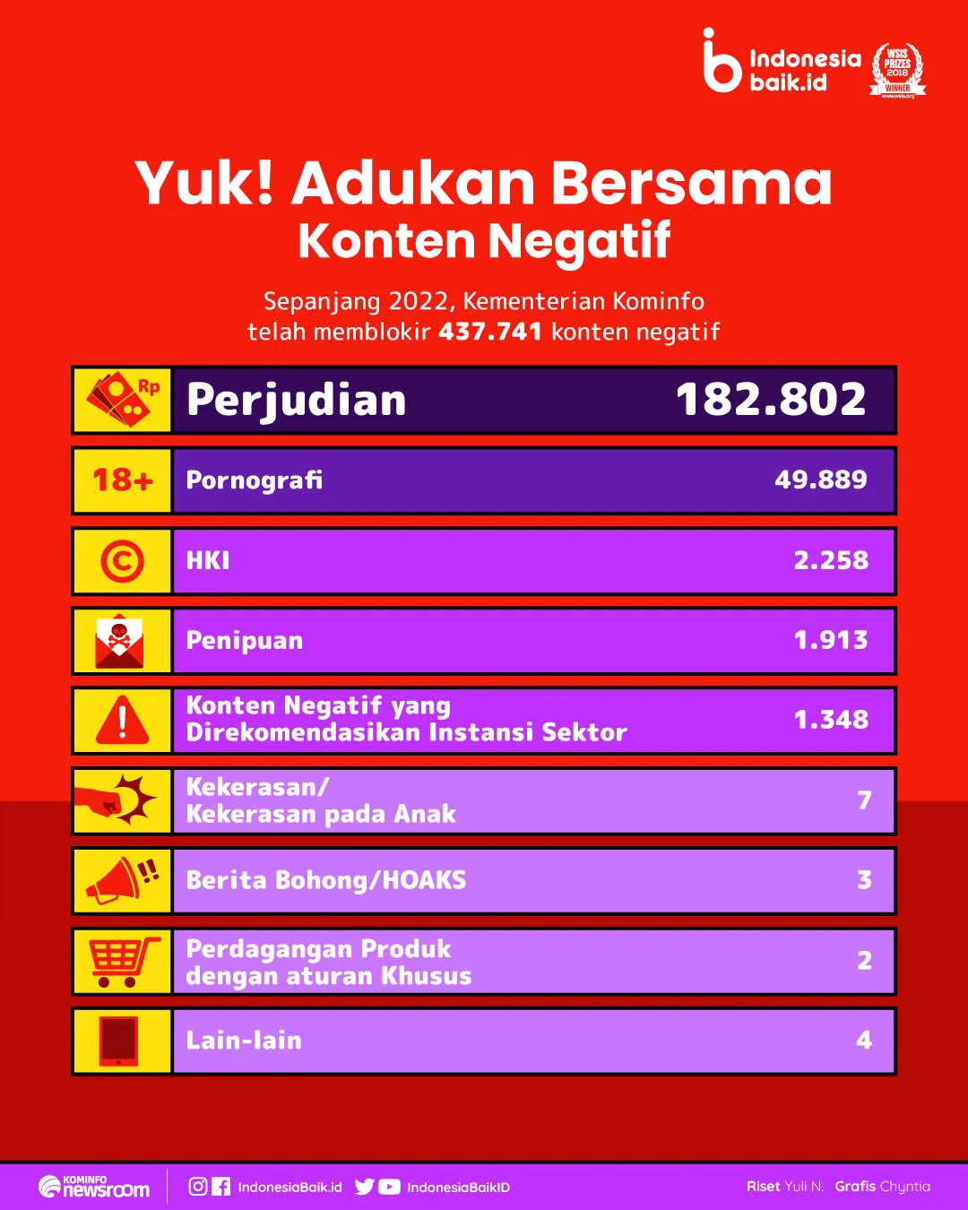 Bahkan, berdasarkan Data Statistik Penangangan Konten Internet Negatif Pada Situs juga mencatat total pemblokiran konten negatif yang telah dilakukan Kementerian Kominfo mencapai 437.741 loh!