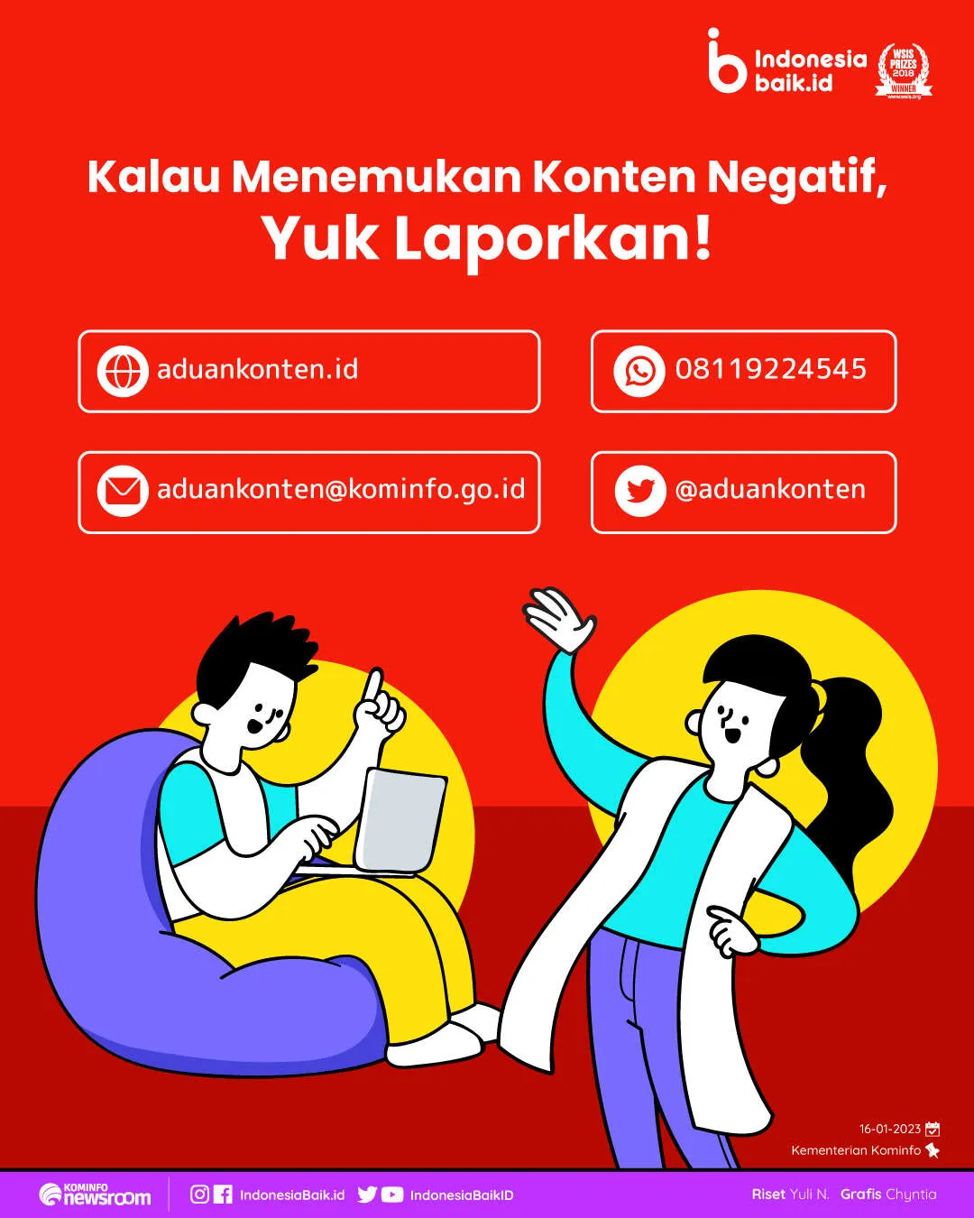 Aduan masyarakat terkait konten bermuatan negatif dapat dilaporkan melalui laman aduankonten.id, email , maupun melalui akun Twitter @aduankonten. Selain itu, bisa juga diakses melalui WhatsApp di nomor 08119224545.