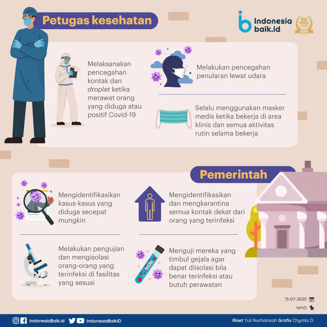 - Selalu melaksanakan pencegahan kontak dan droplet ketika merawat orang yang diduga atau telah terkonfirmasi positif Covid-19.