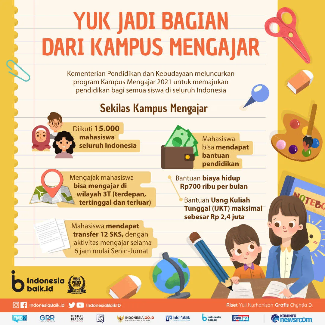 Indonesiabaik.id - Kementerian Pendidikan dan Kebudayaan meluncurkan program Kampus Mengajar 2021. Melalui program Kampus Mengajar Angkatan 1 Tahun 2021, sebagai implementasi Kampus Merdeka mengajak mahasiswa bisa mengajar di wilayah 3T (terdepan, tertinggal dan terluar).