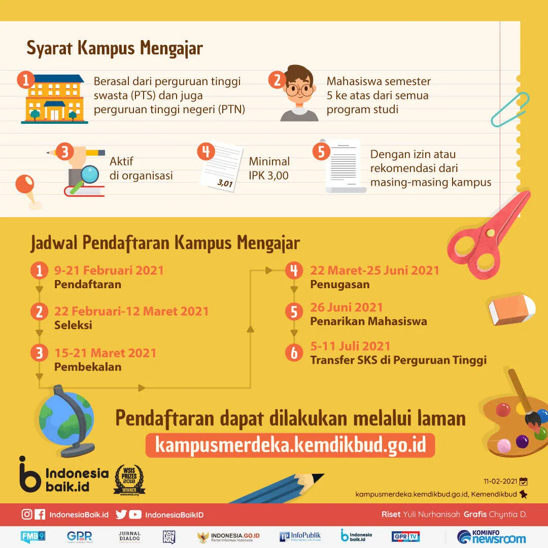 Untuk periode Kampus Mengajar, dimulai pada 9 Februari hingga 11 Juli 2021. Berikut alur pendaftaran Kampus Mengajar 2021: