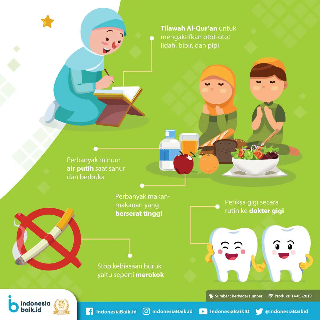 Pertama, menyikat gigi minimal dua kali setelah makan sahur dan sebelum tidur malam harus dilakukan agar sisa-sisa makanan yang ada di mulut bisa dibersihkan. Kedua, berkumur saat berwudhu dapat membantu mengurangi gejala mulut kering saat kita berpuasa. Selain itu, tilawah Al qur’an saat berpuasa dapat mengaktifkan otot-otot lidah, bibir, dan pipi. Dengan aktifnya otot tersebut maka kelenjar liur akan lebih aktif untuk mengalirkan air liur ke dalam rongga mulut.