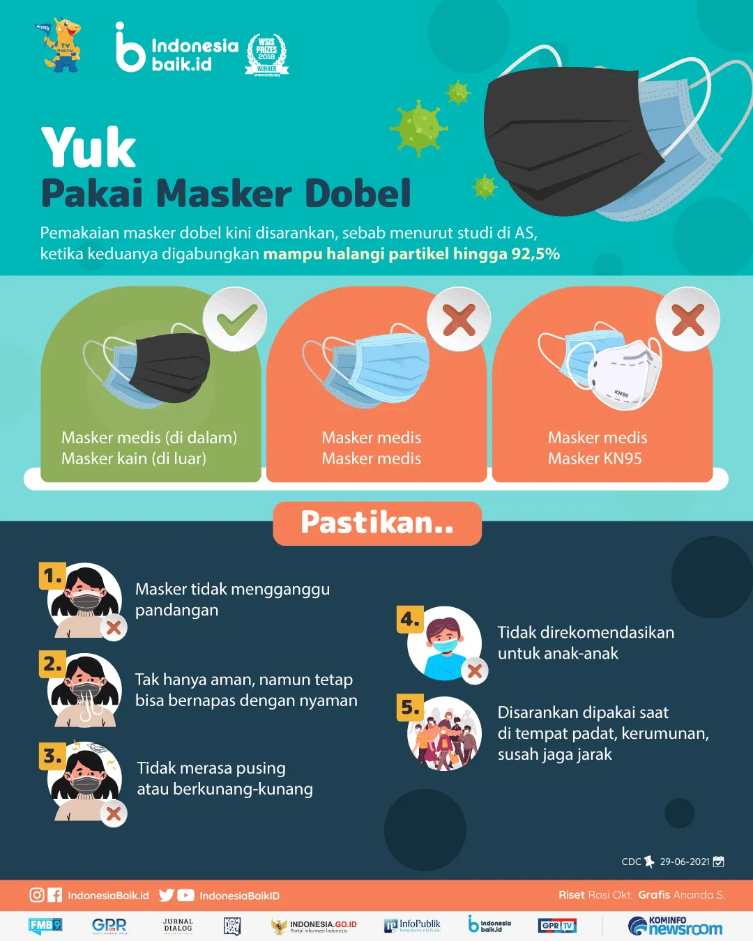 indonesiabaik.id - Pusat Pengendalian dan Pencegahan Penyakit (CDC) saat ini merekomendasikan penggunaan masker dobel sebagai cara untuk meningkatkan kesesuaian masker dan mengurangai penyebaran COVID-19.