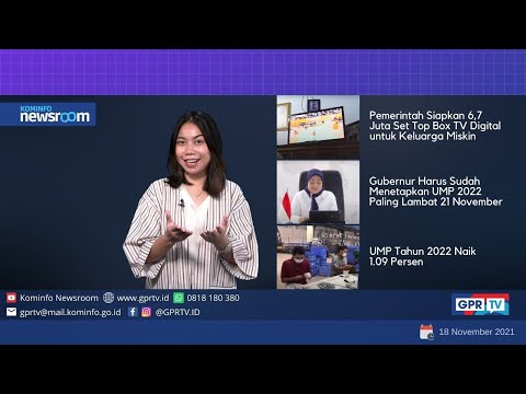 Mengawali berita hari ini, pemerintah siapkan 6,7 juta Set Top Box TV Digital untuk keluarga tidak mampu. Selanjutnya, UMP tahun 2022 yang naik 1,09 persen dan Gubernur di tiap daerah harus sudah menetapkan UMP 2022 paling lambat pada tanggal 21 November 2021. Jika masa kerja lebih dari setahun, tiap perusahaan harus memakai standar dan skala upah yang sudah ditetapkan. Selain itu, ada informasi terkait pemberian vaksinasi ketiga atau vaksin booster yang rencananya akan mulai diberikan pada tahun 2022 mendatang. Ikuti terus info terupdate Berita Pemerintah melalui kanal Kominfo Newsroom!